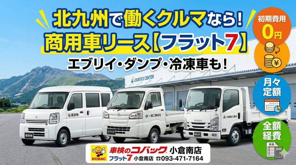 北九州小倉にあるwincubeの店舗は、お得なカーリース専門のフラットセブン小倉南店と、中古車販売メインのコバック小倉南店の2店舗ございます。