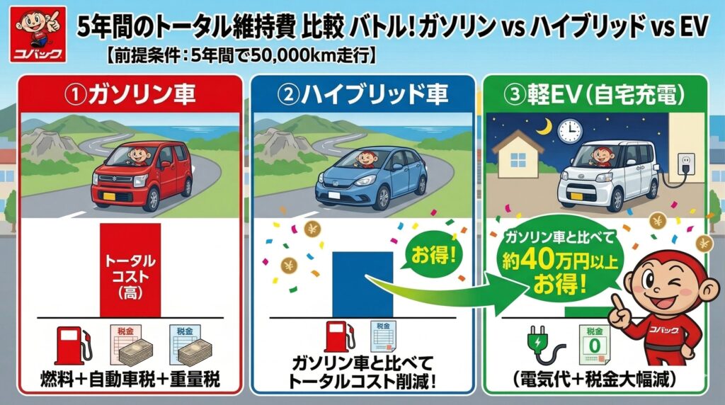 3. 5年間の「トータル維持費」で勝負!ガソリン vs ハイブリッド vs EV