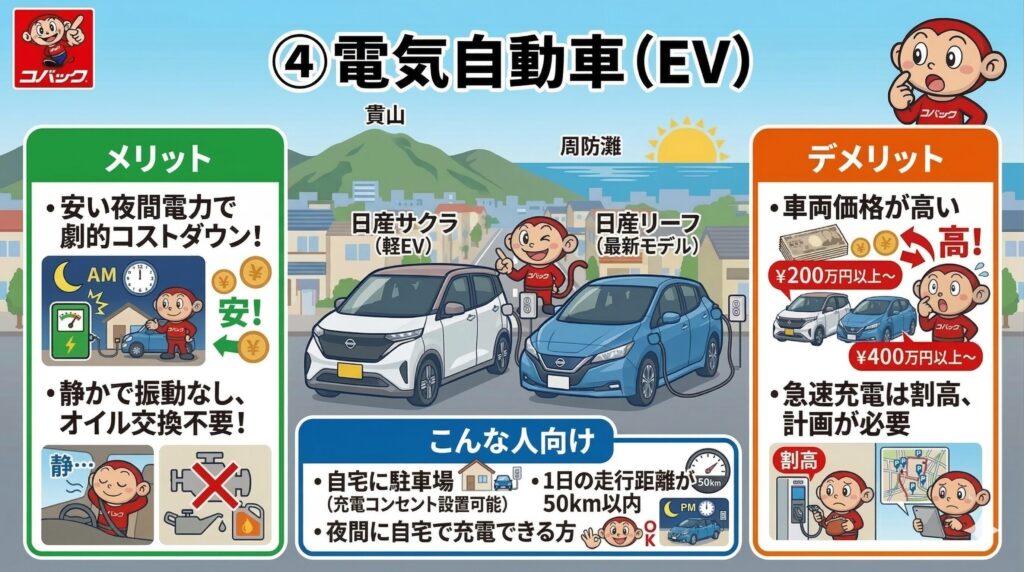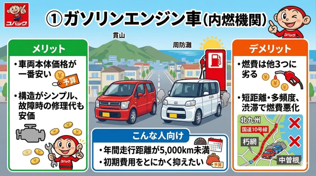 まずは、現在主流となっている4つの動力源について、それぞれの特徴と「私たちの地元・小倉南区の道路事情」に合っているかを整理します。