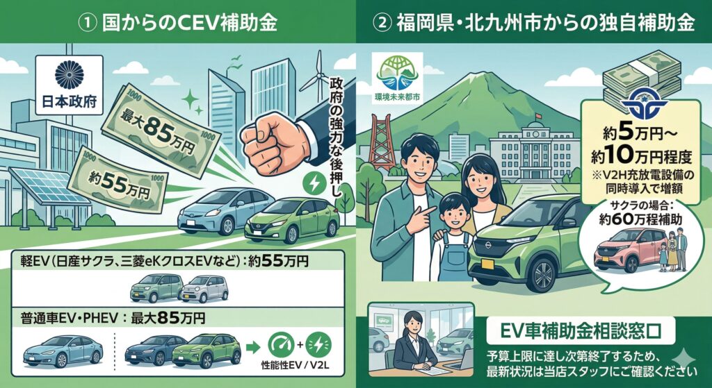 車両本体価格だけでなく、毎月の燃料代、税金、そして**2026年最新の「国と北九州市のEV補助金」**まで網羅した、完全保存版です。小倉南区で車に乗るならどれが一番「元が取れる」のか、プロの目線で白黒ハッキリさせましょう!