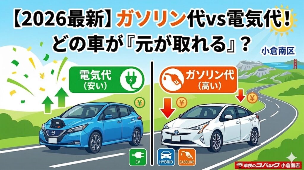 2026年現在、レギュラーガソリンの価格は依然として高止まりしています。通勤で毎日国道10号線を使う方や、週末にサンリブシティ小倉へ買い物に行くご家庭にとって、毎月のガソリン代は決して無視できない固定費ですよね。その一方で、電気代も変動しており「EVにしたからといって本当に安くなるの?」と疑心暗鬼になっている方も多いはずです。