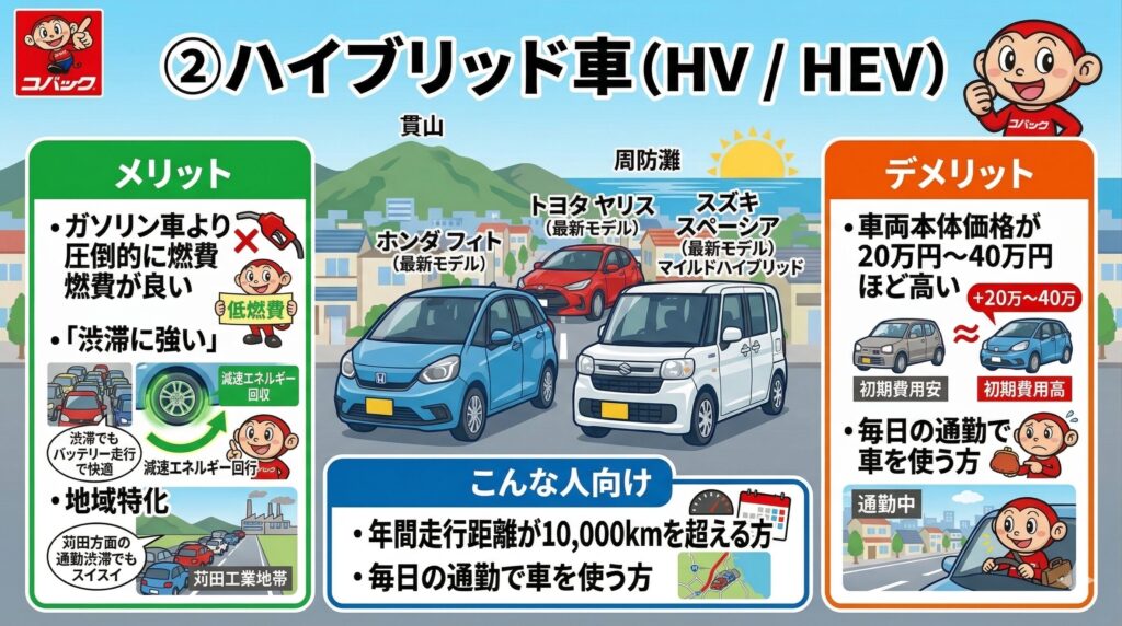 2. ハイブリッド車: 総合的なバランスNo.1。通勤渋滞が多い小倉南区民の強い味方。