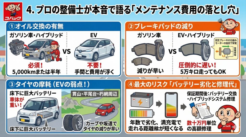 ここまで読むと「じゃあ絶対にEVかハイブリッドがいいじゃん!」と思われるかもしれません。しかし、コバック小倉南店の整備士だからこそお伝えしなければならない**「裏のコスト」**が存在します。