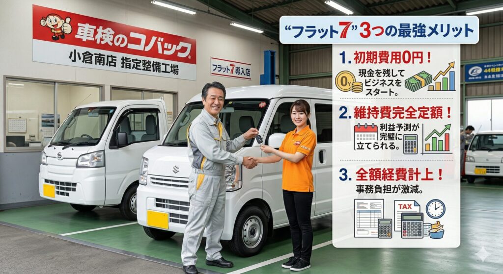 これらのリスクと負担を一掃するのが、車検のコバック小倉南店が提供するカーリース「フラット7」です。なぜ商用車にリースが最適なのか、その理由は明確です。