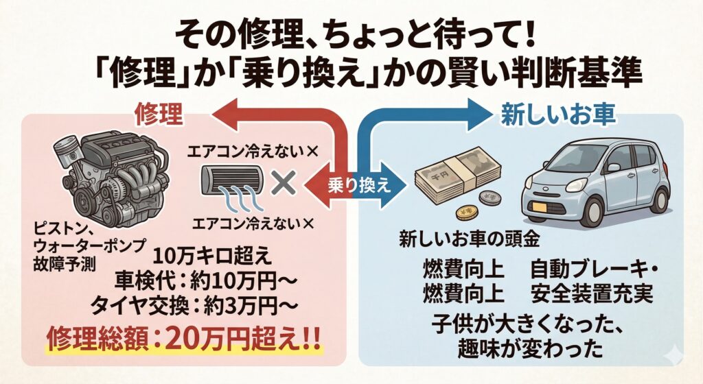 ここまでよくあるトラブルと解決法をご紹介してきましたが、もし車が古くなってきてトラブルが重なるようになった場合、多くの方が直面するのが**「高いお金を出して修理するか、思い切って車を買い替えるか」**という悩みです。