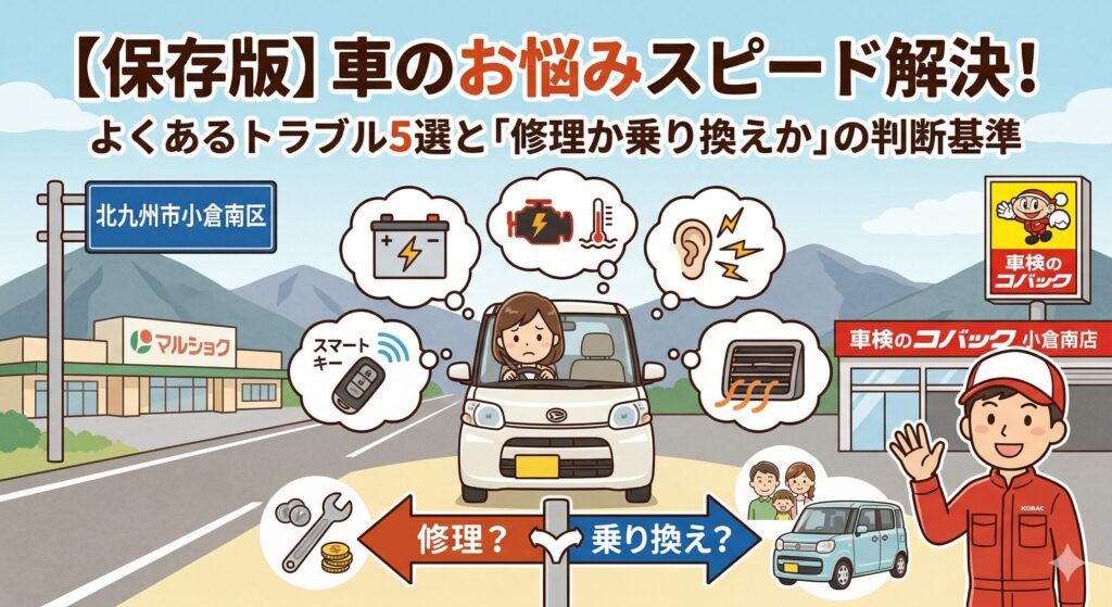 そこで今回は、車検のコバック小倉南店に寄せられる**「お客様からのよくあるお悩み・トラブル」**を5つピックアップし、その原因と対処法、そしてプロ目線でのアドバイスを徹底的に解説します!