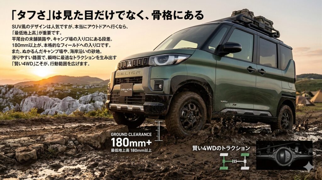 「デリカ」の名を冠する以上、その性能に妥協はありません。軽自動車の常識を覆す、圧倒的な走破性と存在感を持った一台です。
