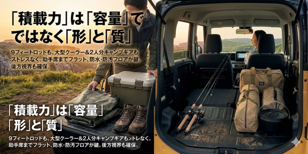 これをクリアするためには、**「助手席まで完全にフラットになるか」が鍵になります。さらに、「汚れへの強さ」**も必須。泥だらけのブーツや、濡れたウェーダーをそのまま放り込める「防水・防汚フロア」は、遊びの後のストレスを激減させます。
