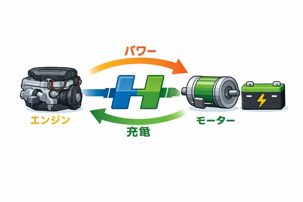 エンジンとモーターが協力して動く仕組みのため、